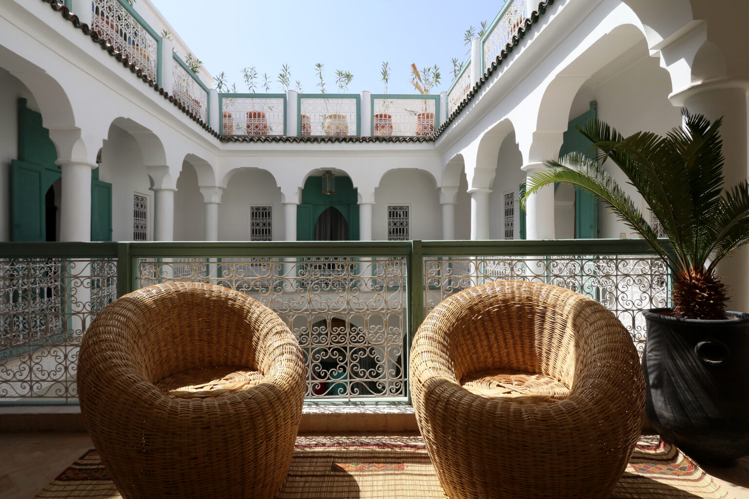 Installez-vous dans l’intimité d’un patio baigné de lumière, où chaque détail invite à savourer le raffinement et la sérénité d’un riad d’exception.