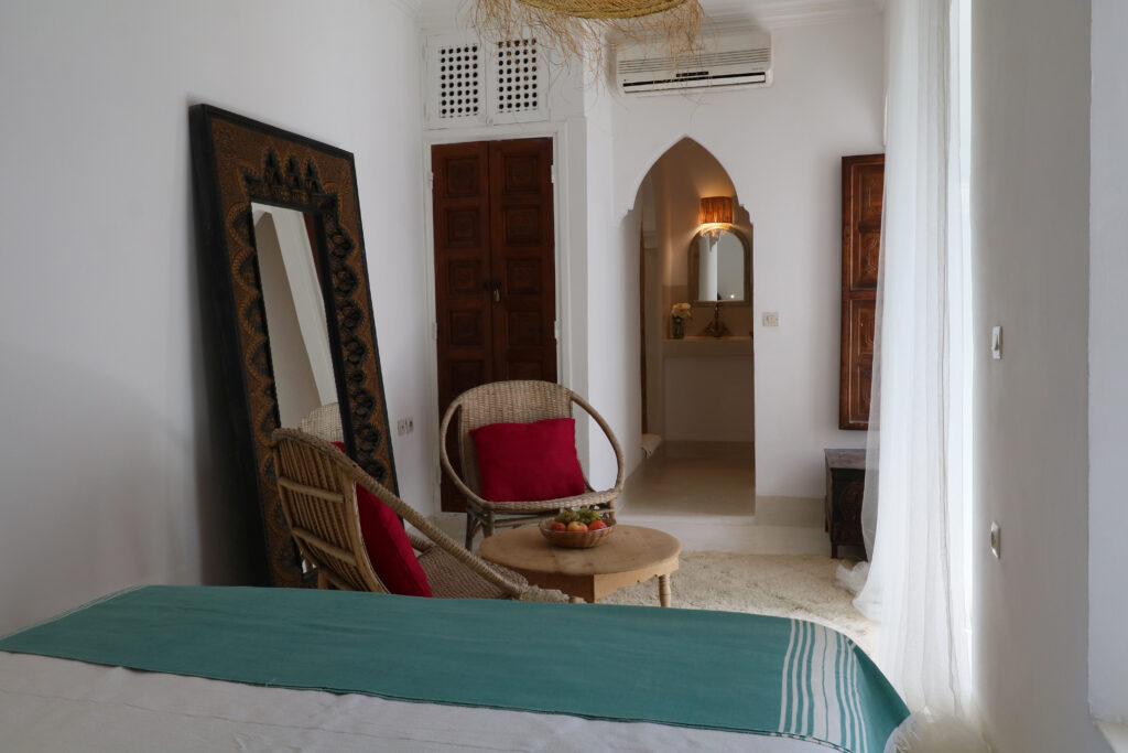 La chambre RMADIA, nichée au premier étage, marie élégance et confort dans une ambiance douce et apaisante. Dotée d’un lit queen size, d’une salle de bain privative et d’une décoration subtile, elle promet un séjour reposant, tout en offrant une vue sur le patio typique du riad. Un refuge idéal pour savourer l’atmosphère authentique de Marrakech